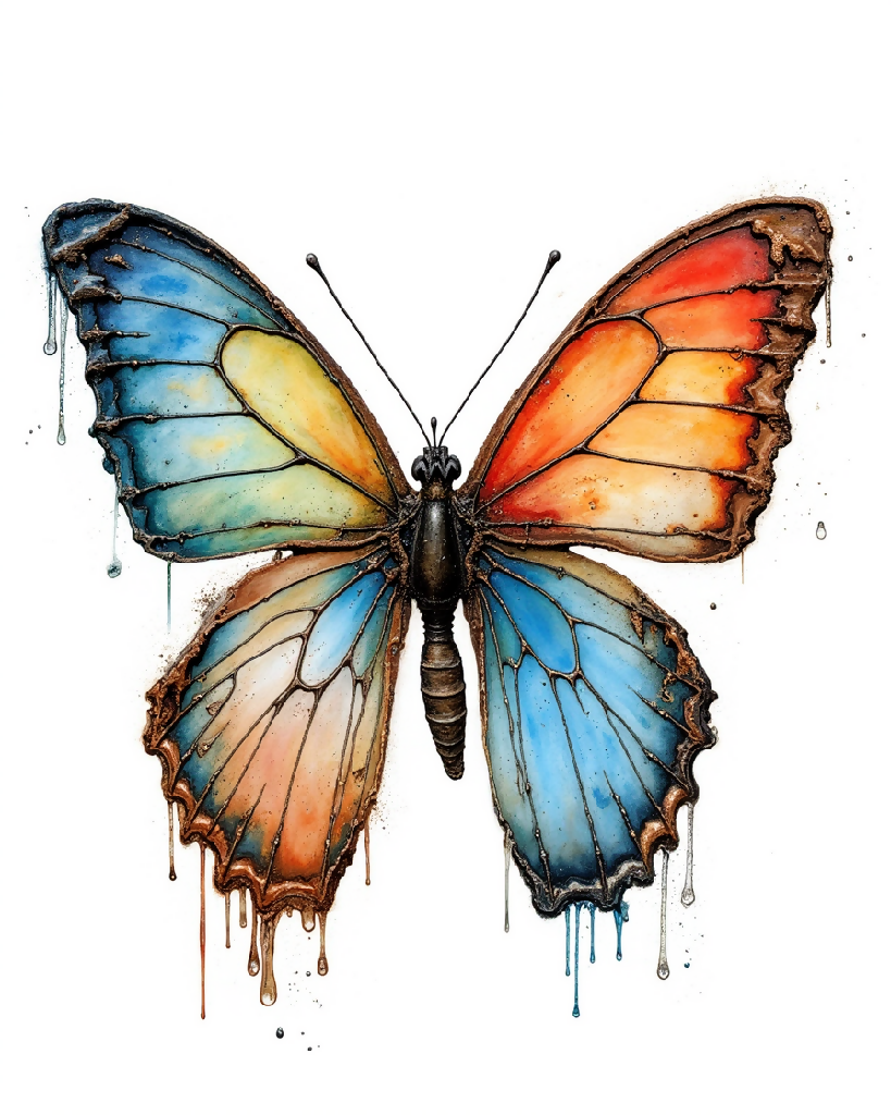 It is a stylized multicolored butterfly with a white background to highlight all its beauty.