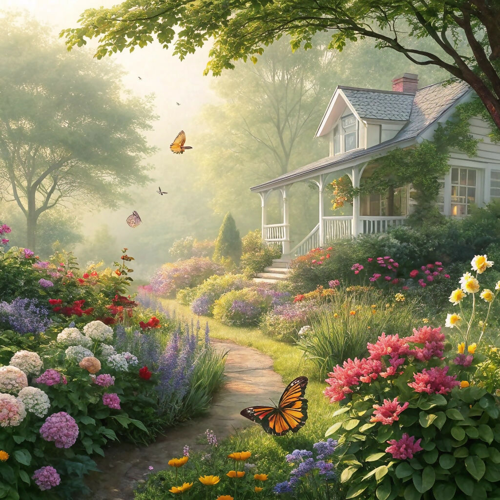 The house sits nestled within a vibrant garden. Colourful flowers, including hydrangeas, roses, and various other blooms in shades of pink, purple, red, yellow, and orange, fill the gardens; lush bushes and trees surround the house and garden path.