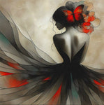 An elegant figure in a black dress with flowing fabric that resembles wings. The hair is adorned with a red and orange butterfly accessory, adding a vibrant touch. The monochromatic palette contrasts with the textured background, creating an intriguing blend of realism and abstraction