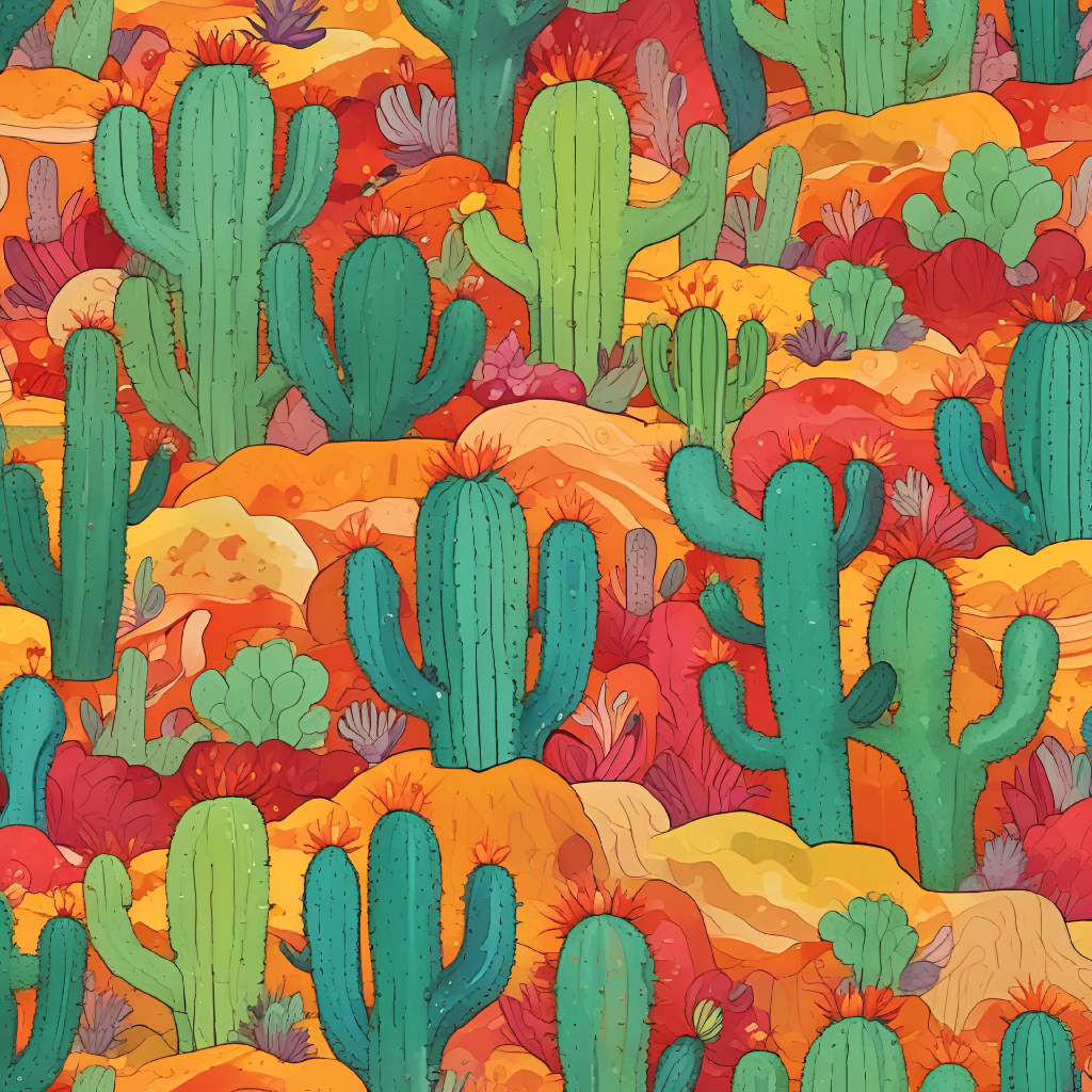 This is a colorful and lively illustration of a cactus-filled desert landscape. The artwork features various types of cacti in shades of green, set against a warm and vibrant background of red, orange, and yellow hues. The scene is dense with vegetation, showcasing an array of cacti and desert plants in a stylized and whimsical manner.
