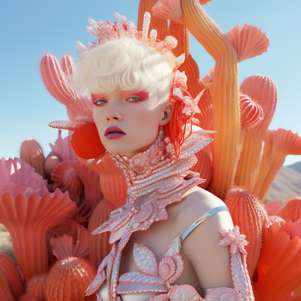 Tags: cactus couture, bloom tension, surreal fashion, desert bloom, avant-garde, editorial art, wearable rebellion, pastel resistance, AI couture