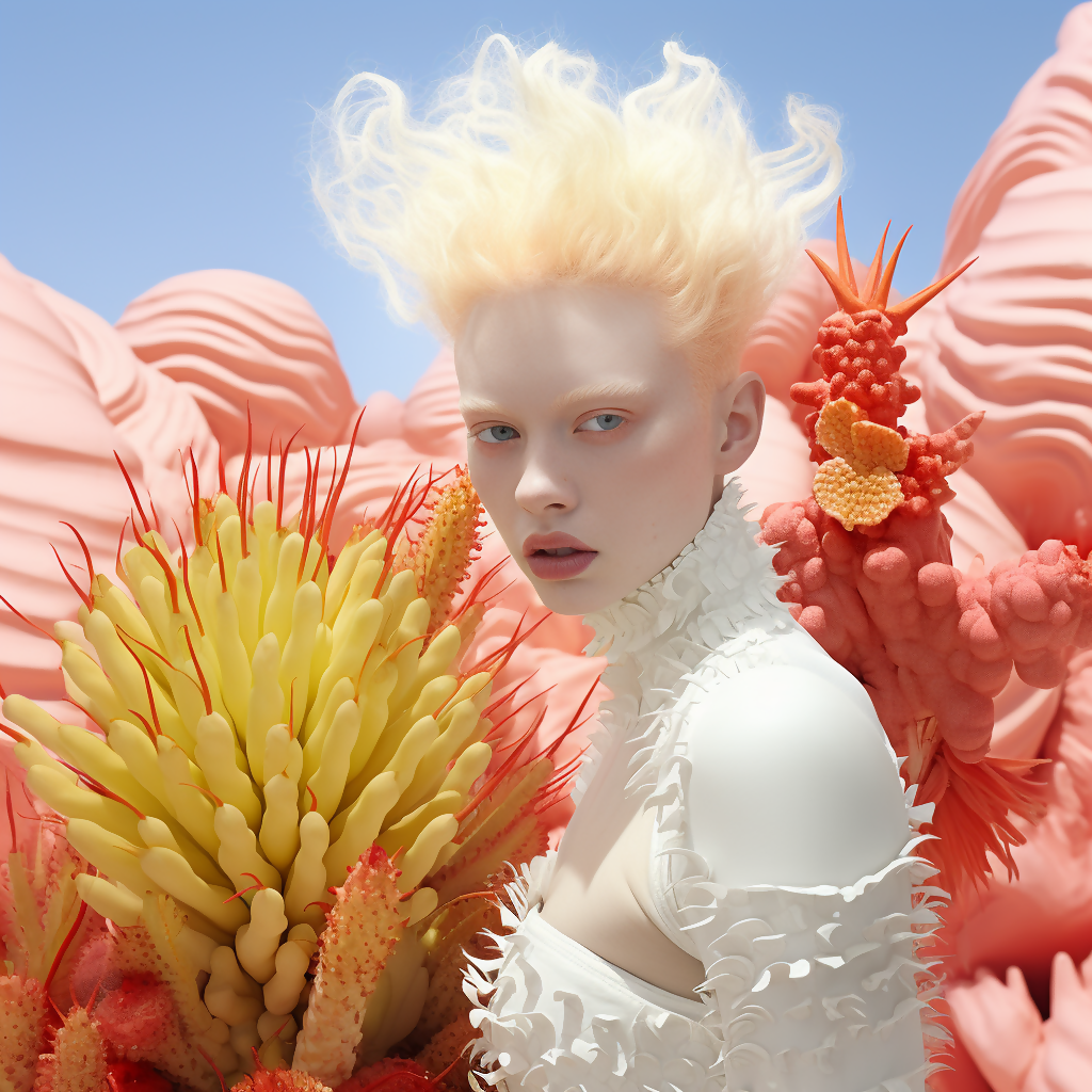 Tags: cactus couture, desert fashion, surreal art, AI artwork, avant-garde, floral headpiece, editorial style, cactus glam, fashion fantasy, wearable art