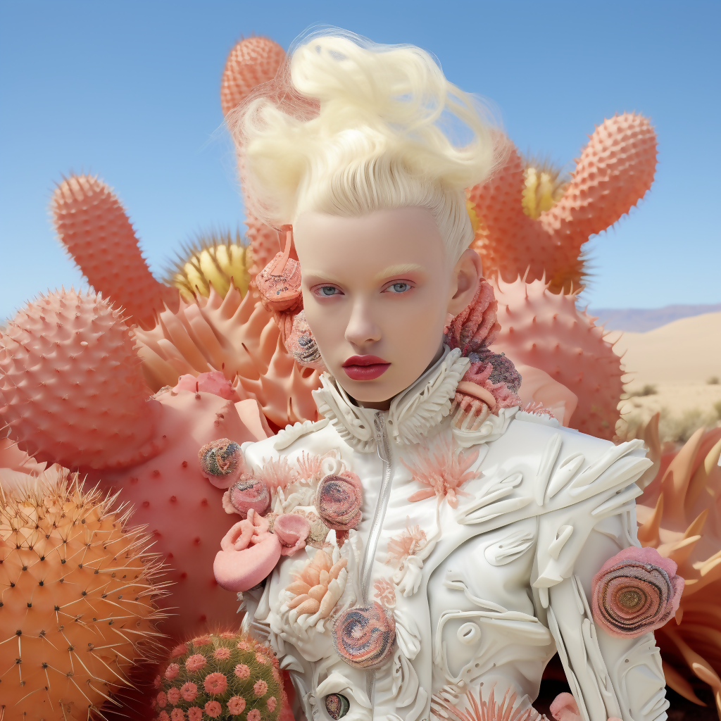 Tags: cactus couture, desert fashion, surreal art, AI artwork, avant-garde, floral headpiece, editorial style, cactus glam, fashion fantasy, wearable art