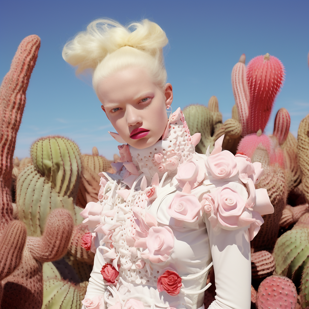 Tags: cactus couture, tender riot, surreal fashion, desert bloom, avant-garde, editorial art, wearable rebellion, pastel punk, AI couture