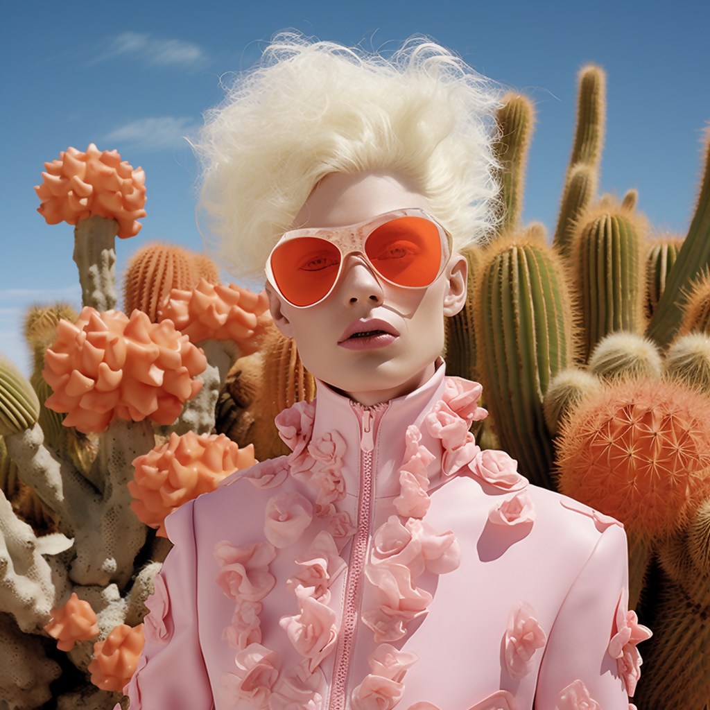 Tags: cactus couture, desert fashion, surreal art, AI artwork, avant-garde, floral headpiece, editorial style, cactus glam, fashion fantasy, wearable art