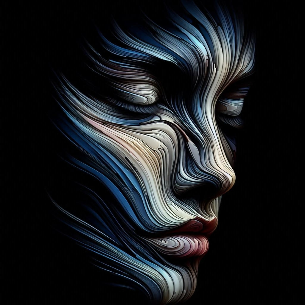 A close-up of a calm woman’s face in black and white reveals soft contours and gentle shadows. Her serene expression is highlighted by the play of light and shade, with multiple lines in her face conveying quiet strength and tranquility. The absence of color emphasizes the purity of her stillness and the timeless grace of her features.
