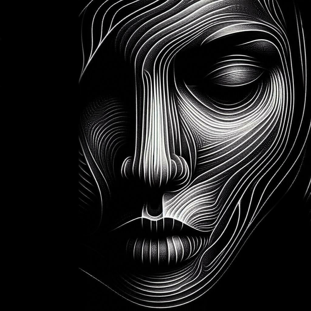 A close-up of a calm woman’s face in black and white reveals soft contours and gentle shadows. Her serene expression is highlighted by the play of light and shade, with multiple lines in her face conveying quiet strength and tranquility. The absence of color emphasizes the purity of her stillness and the timeless grace of her features.
