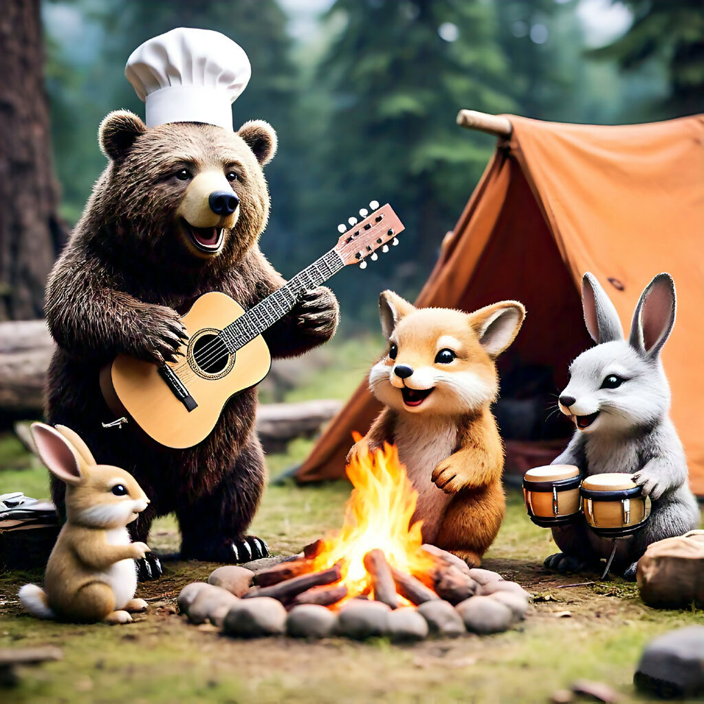 Step into a magical woodland evening with Campfire Serenade, where a bear in a chef’s hat strums a soulful tune on his guitar, joined by a rhythm-loving rabbit on bongos and a fox lost in song. This AI-generated illustration captures a heartwarming moment of forest camaraderie, blending music, nature, and imagination. Inspired by the idea that every creature has a story to tell, this artwork invites viewers into a world where animals share campfire tales and melodies under starlit skies. Perfect for children’s rooms, storytelling corners, or anyone who believes in the magic of the wild.