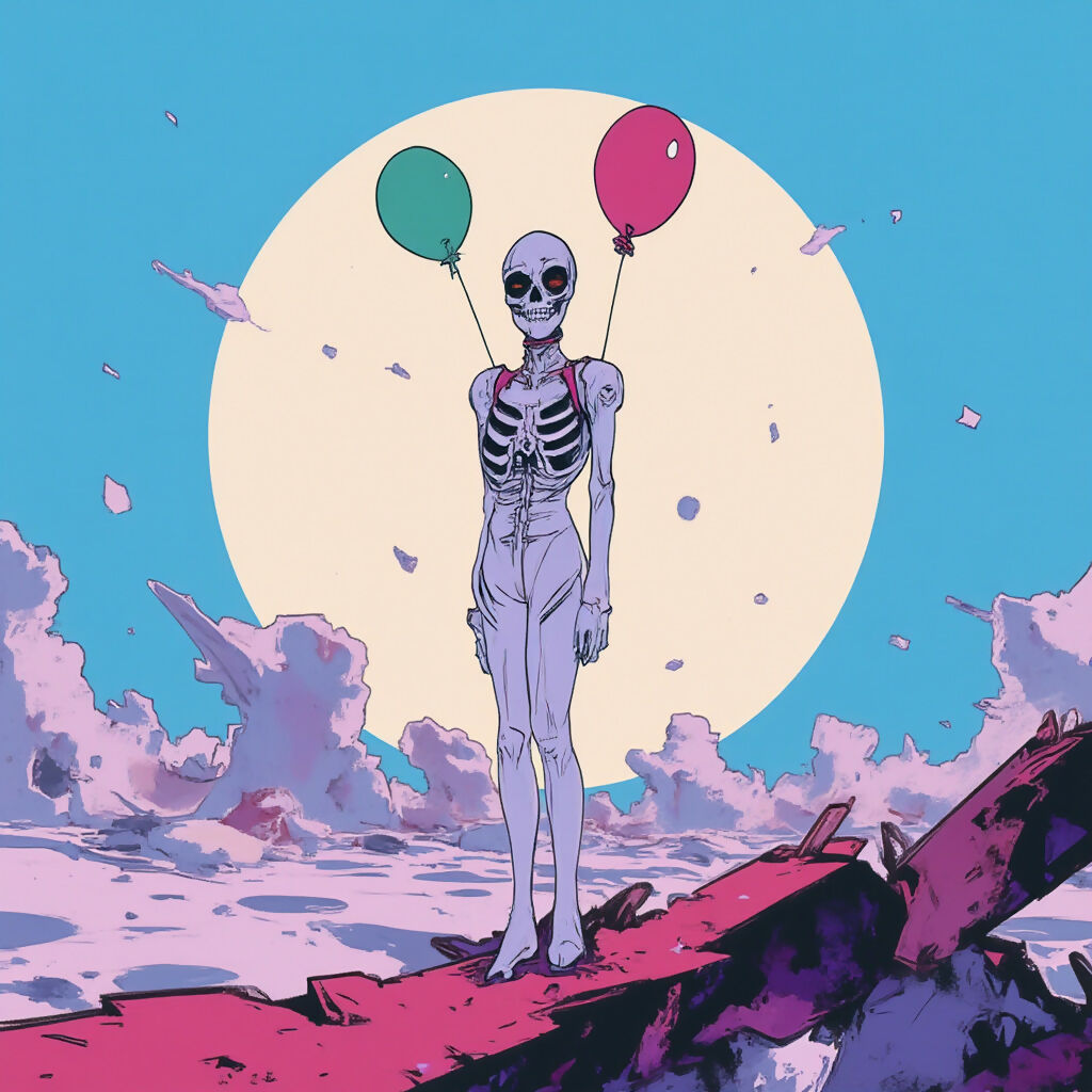 This piece is part of my Skeletons & Aliens series, one of four in the collection. It depicts a skeleton drifting through space, guided by balloons, eventually landing on Pluto. The soft pink and peach tones bring a harmonious balance to the artwork and illustration.