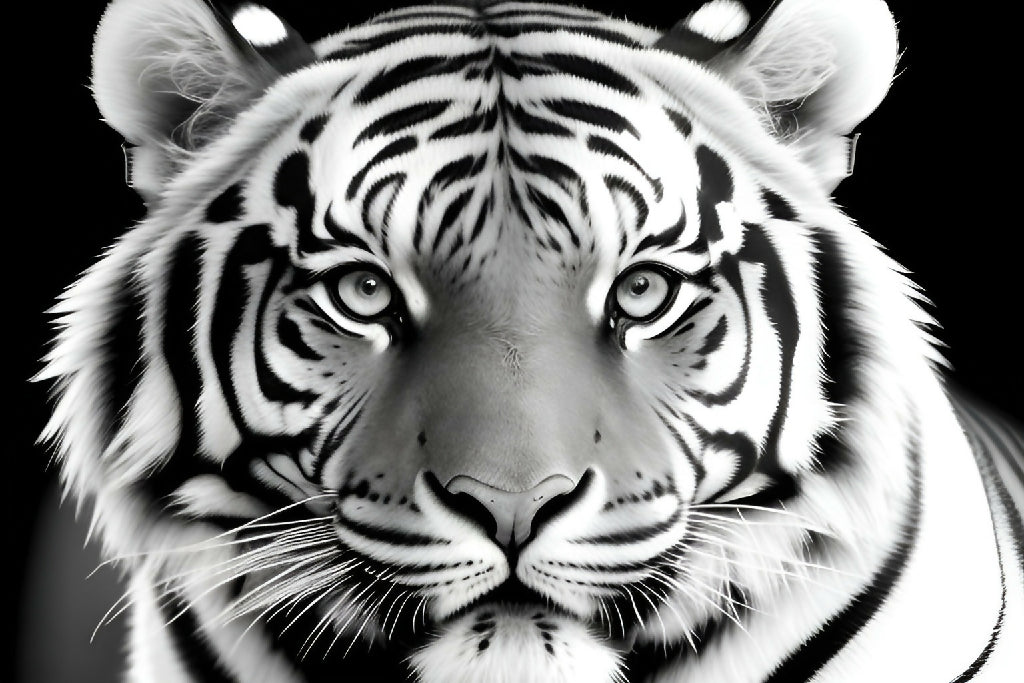 The image is a close-up of a tiger, showcasing its distinct features such as the snout and fur patterns. The tags suggest it includes types like Bengal and Siberian tigers, highlighting the beauty of this big cat in wildlife. The use of black and white may add an artistic touch to the depiction.