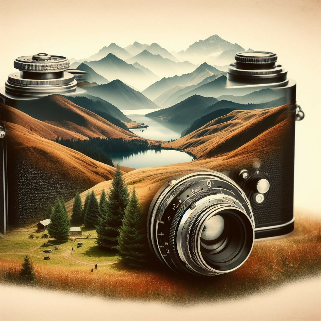 A breathtaking mountainous landscape seamlessly blended within the silhouette of a camera. The rugged peaks and serene valleys are framed by the camera's outline, symbolizing the art of photography and the beauty of nature. This piece invites viewers to explore the world through the photographer's eye, capturing the essence of adventure and discovery.
