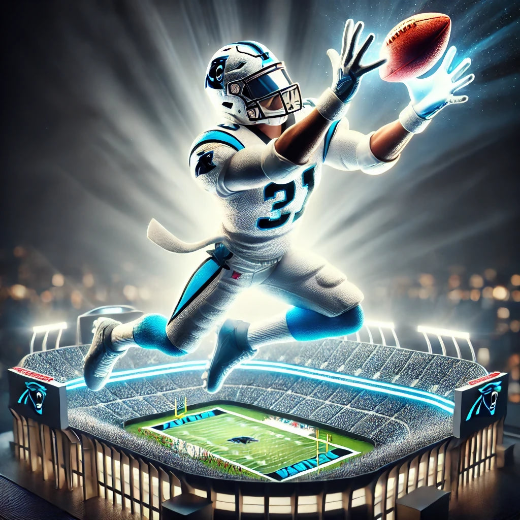 Experience the ultimate fusion of sports and art with this electrifying Carolina Panther collectible! Featuring a dynamic football player mid-catch, glowing with energy and intensity, this stunning display piece brings the thrill of the game right to your space. Crafted with vibrant detail, a miniature stadium base, and illuminated goalposts, it's the perfect centerpiece for any Panther fan, sports enthusiast, or collector. Elevate your game-day setup and celebrate your team with this one-of-a-kind masterpiece—get yours today before they're gone!