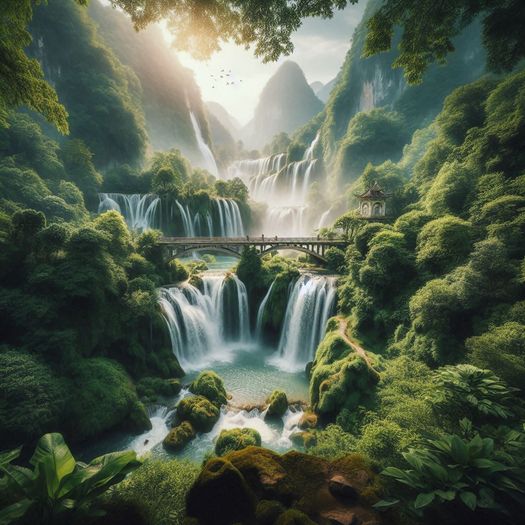 A captivating waterfall flows gracefully through a landscape of dense, vibrant greenery, creating a soothing symphony of nature. A picturesque bridge spans the scene, adding a charming human touch to this natural paradise. The mist, foliage, and flowing water come together to form a breathtaking and serene environment.