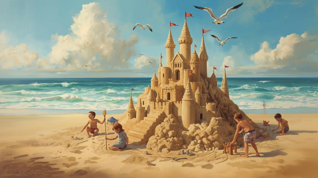Surreal, vivid painting of kids building a life size sandcastle on the beach.
