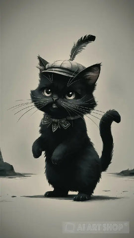 a black Cute cat, Standing on Its hind legs, a cap on Its head, a bow on its neck, in comie styls, minimalism, dark fantasy