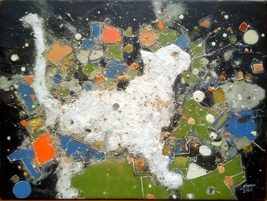 This painting features a striking abstract composition centered around the silhouette of a white cat positioned against a chaotic yet vibrant background. The cat's figure appears textured and almost ethereal, with its body blending into an energetic array of geometric shapes, splatters, and dynamic lines. The white color of the cat stands in stark contrast to the darker tones of the background, creating a sense of movement and depth.