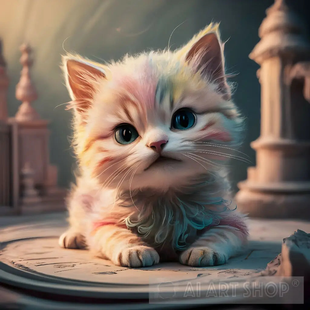 A stunning 3D render of a whimsical baby cat with a captivating pastel sketch art design. The cat's adorable face is filled with playful curiosity as its big blue-green eyes sparkle and its tiny ears perk up. The fur is a mesmerizing blend of soft pastel hues, including pink, blue, and yellow, adding to its enchanting appeal. The background features a dreamy, serene palette, creating an atmosphere of warmth and tranquility. The cinematic-style scene includes architectural elements in the distant background, further enhancing the overall composition. This beautiful blend of color, texture, and emotion makes for a truly captivating piece of art that transcends traditional media boundaries. vibrant, conceptual art, painting, photo, illustration, 3d render, portrait photography, cinematic