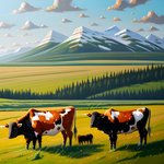 a grassy field with mountains in the background on a sunny day, with cattle standing in the field.