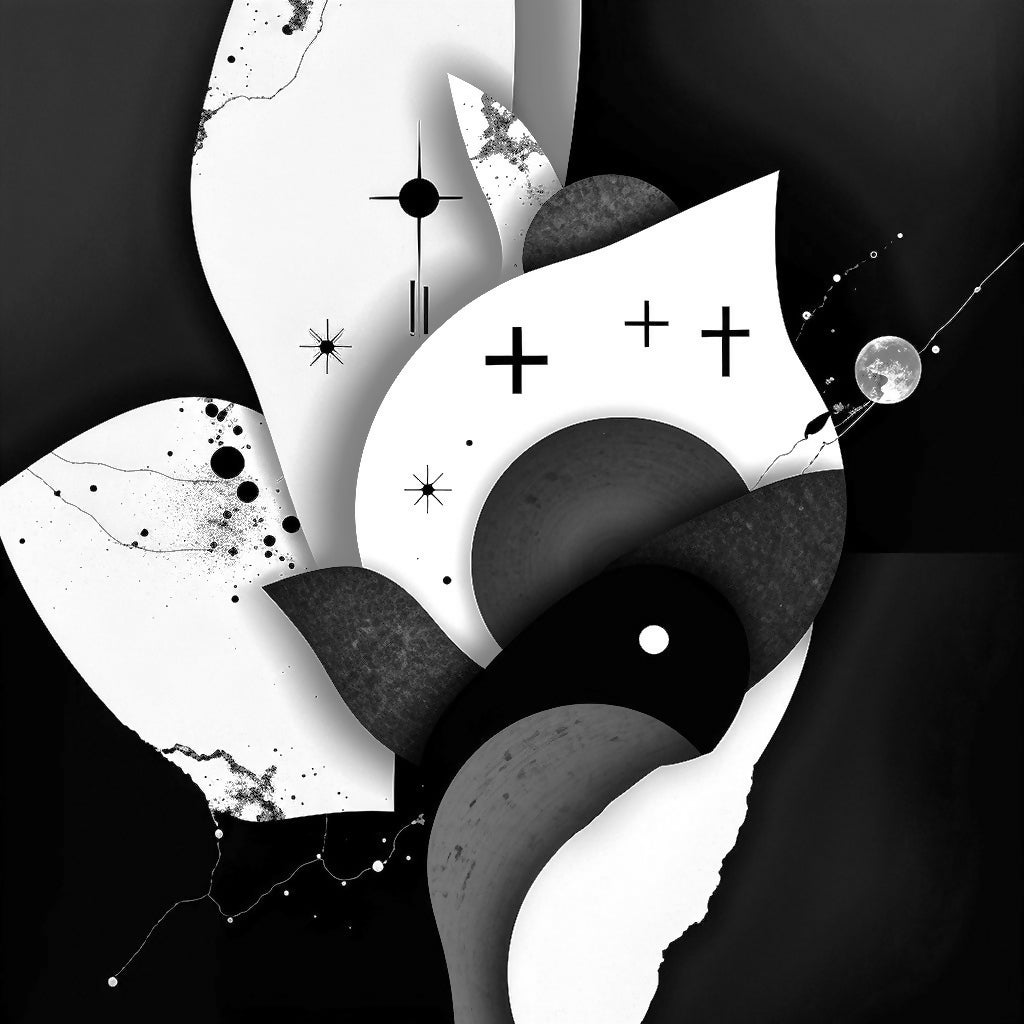 A mesmerizing black-and-white abstract composition featuring geometric elements, symbols, and textured gradients. Overlapping curved and angular forms blend with celestial motifs, creating a visually dynamic and thought-provoking piece.