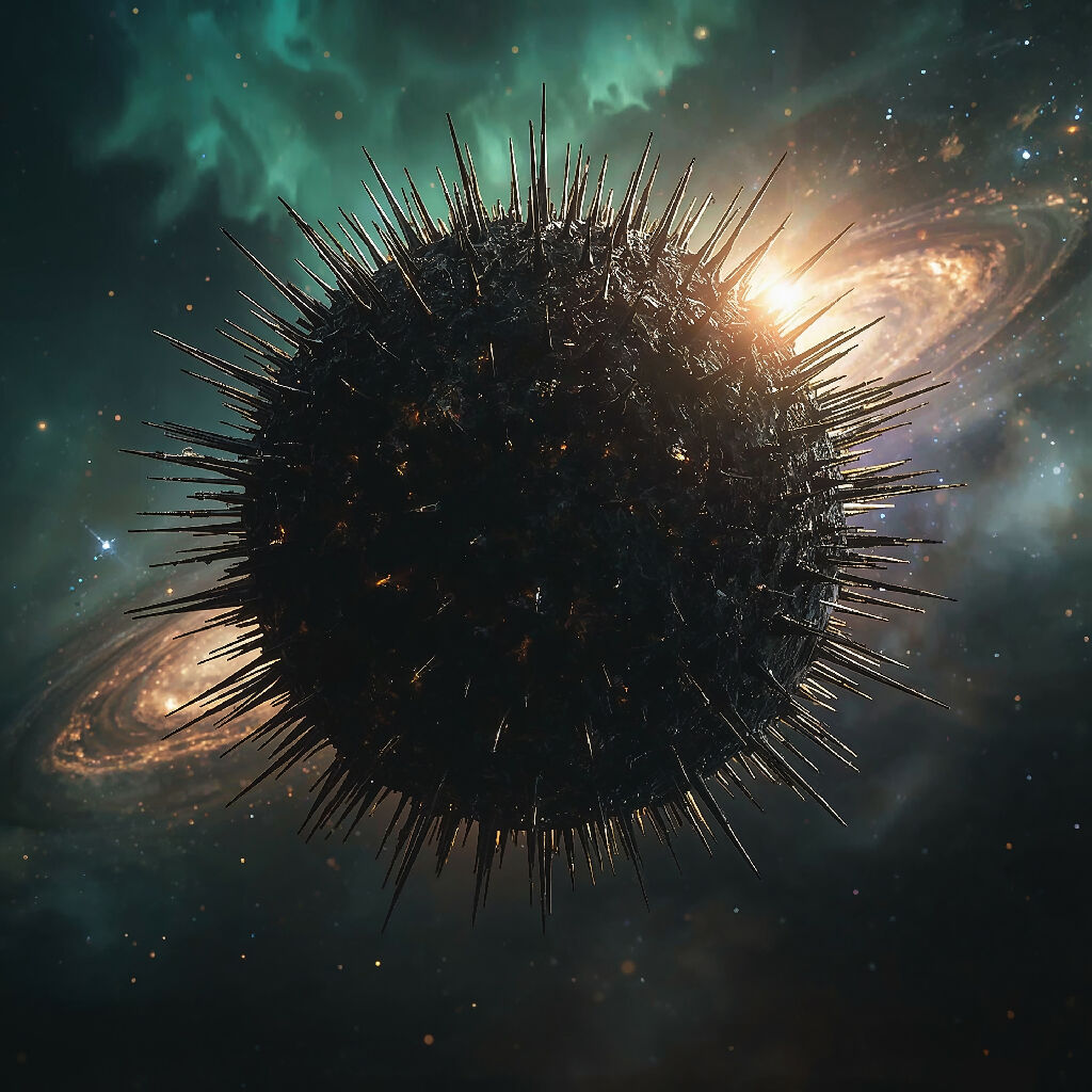 A spherical form bristles with metallic spines against a backdrop of swirling cosmic gases and distant galaxies. The central mass suggests both organic defensiveness and mechanical precision, its thorns catching starlight like weaponized jewelry. Nebular clouds spiral in chromatic waves of emerald and amber, framing this enigmatic object as both destroyer and protector. The composition evokes themes of cosmic evolution and survival, where beauty and danger coexist in perfect tension. This celestial sea urchin or stellar mine drifts through space as a testament to nature's dual capacity for creation and annihilation.
