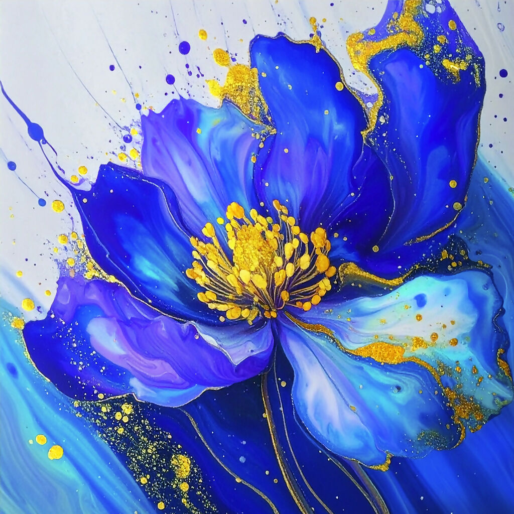 Let your space bloom with the brilliance of Celestial Bloom, a mesmerizing fusion of color and motion. This AI-generated artwork captures a radiant blue and violet flower bursting to life with gold accents, evoking the essence of cosmic beauty and floral elegance. With its rich textures and dynamic flow, this piece invites contemplation and wonder—perfect for modern interiors, art lovers, and dreamers alike.