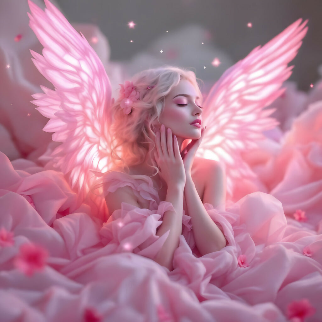“Celestial Bloom” is an enchanting AI-generated portrait of an angel bathed in pink glow and surrounded by cascading soft fabrics. Her luminous wings shimmer with otherworldly light as she surrenders to serenity with eyes closed and hands gently raised in prayer or praise. Pink blossoms and cloud-like folds complete this ethereal vision of love and light.