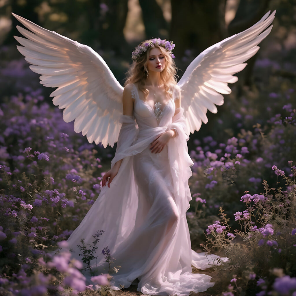 Graceful and serene, she walks through a lavender field touched by the first rays of dawn. Her wings, like ivory silk, catch the morning sun, while her floral crown adds an ethereal softness to her divine presence. This image radiates purity, rebirth, and hope—a heavenly moment frozen in gentle light.