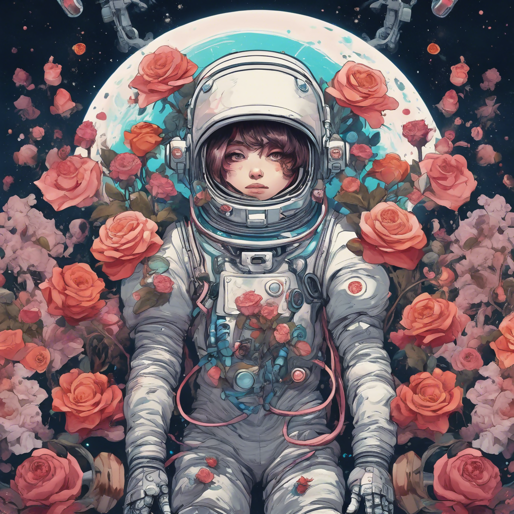 An astronaut surrounded by vibrant roses against a cosmic background in space.