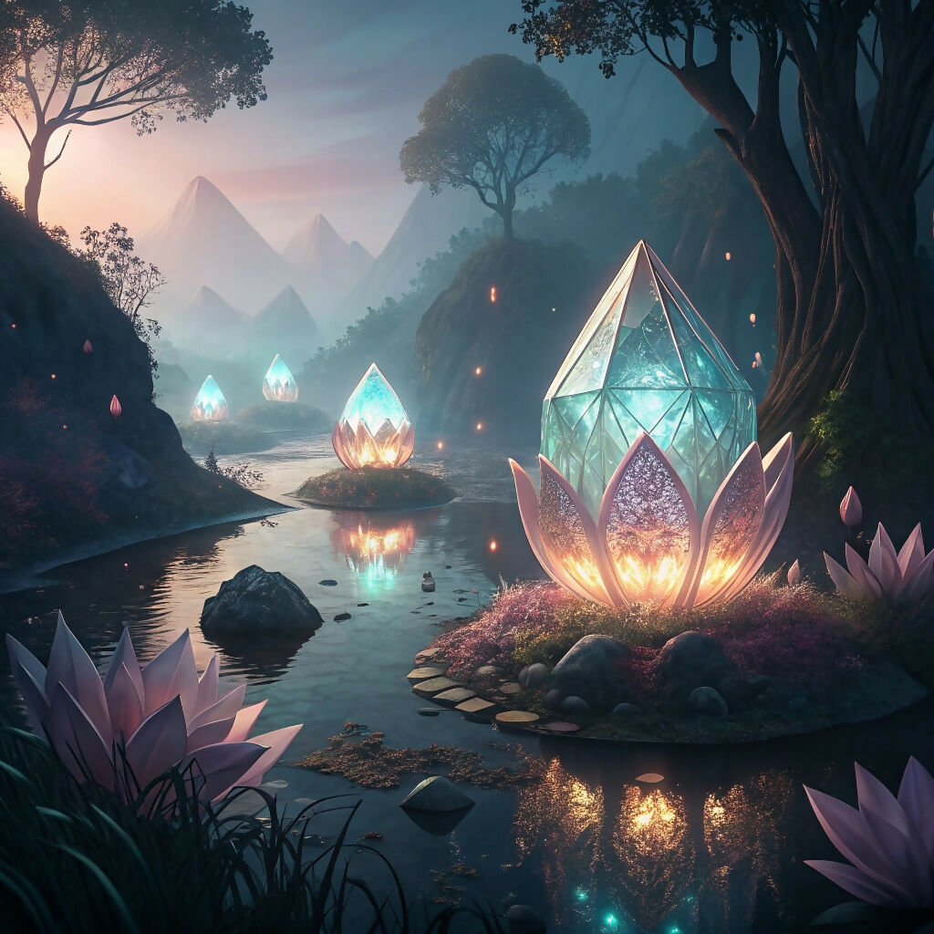 These islands feature structures resembling large, luminous crystals, shaped like diamonds. They are nestled inside stylized, glowing, light-pink lotus flower blossoms. The crystals themselves are various shades of light teal and blue, seeming to emanate a soft, internal glow. This glow is also reflected in the water