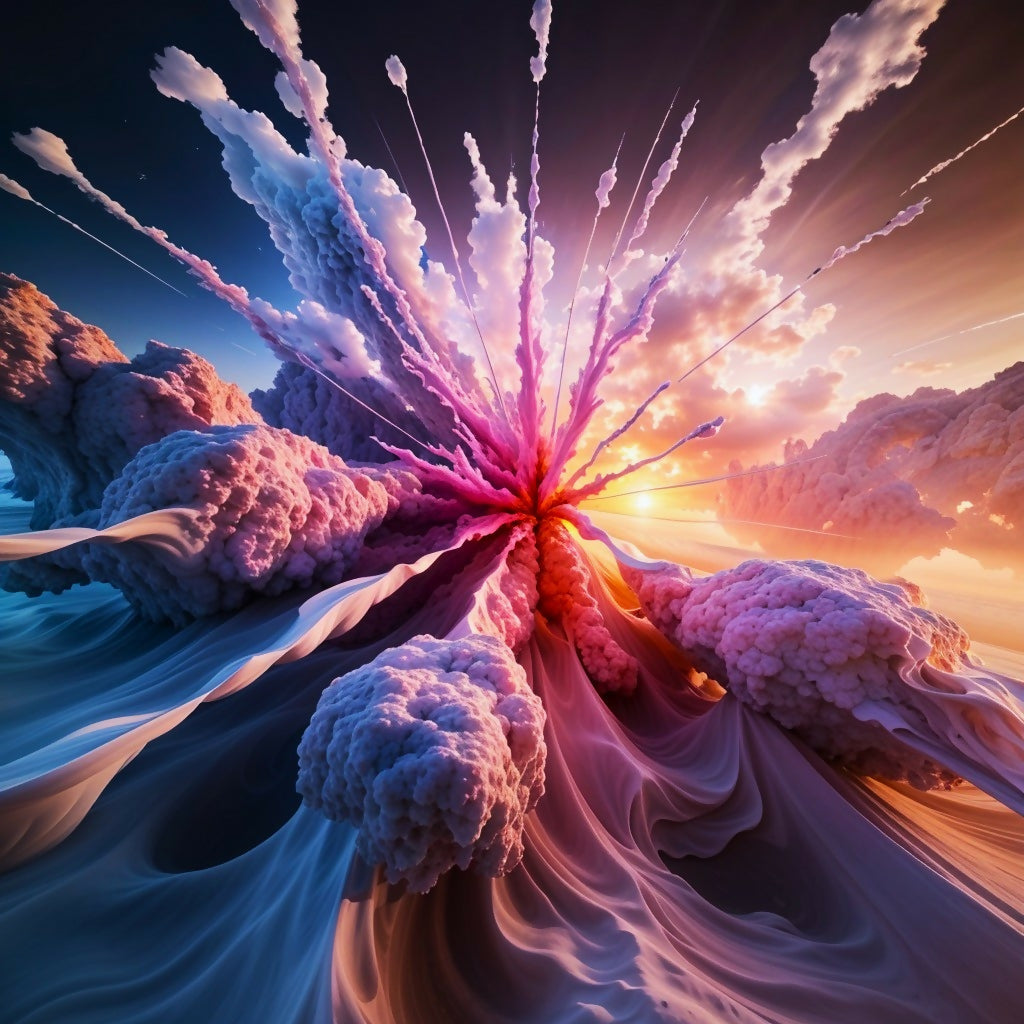 An awe-inspiring abstract artwork featuring a dynamic explosion of swirling clouds in radiant pink, purple, and blue hues. The backdrop of a golden sunset enhances the contrast, creating a breathtaking fusion of warmth and vibrancy, ideal for modern interiors and artistic collections.