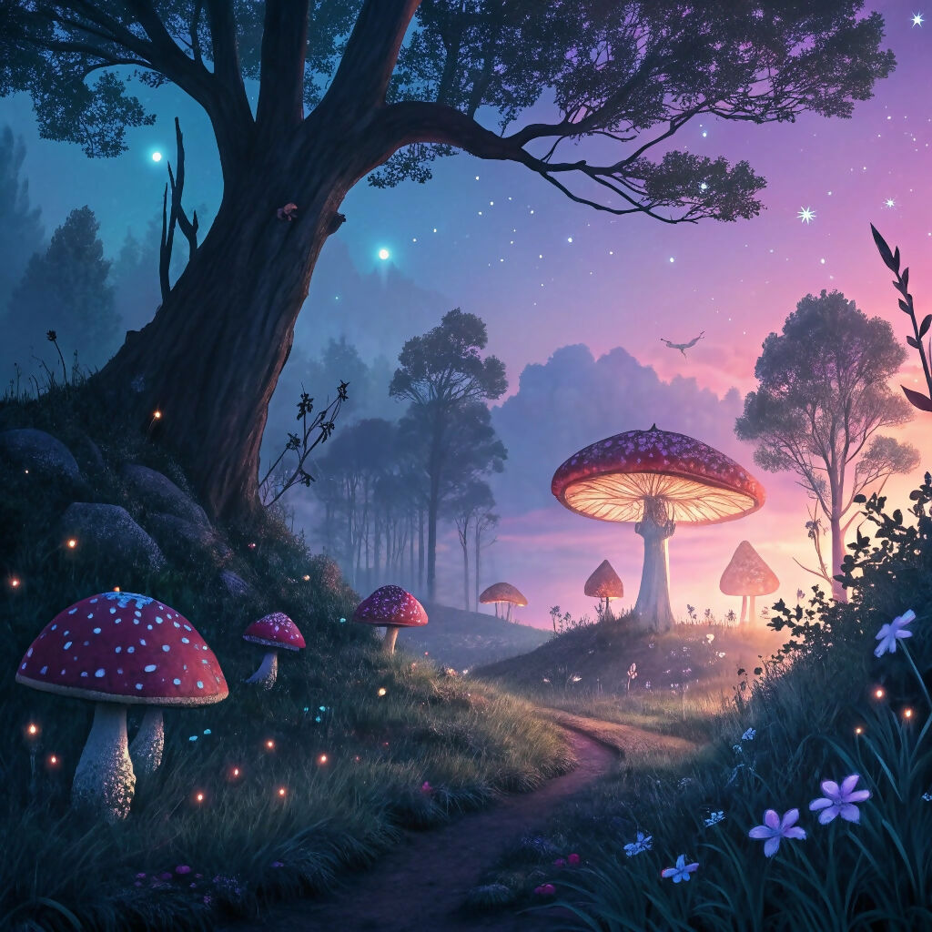 A digital painting depicts a whimsical forest at twilight or dawn. The scene is bathed in a soft, pastel light, creating a dreamy, ethereal atmosphere. Pink and purple hues dominate the sky, dotted with sparkling stars. Tall, dark trees line a gently rolling landscape, their silhouettes blurred by the soft light.