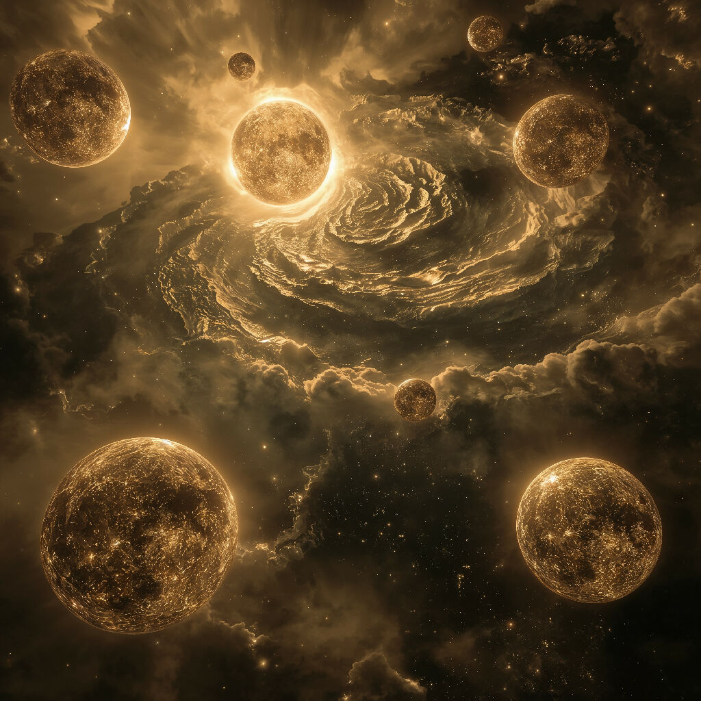Multiple moon-like spheres float within a golden nebular atmosphere, creating a dreamscape of cosmic harmony. The central luminous body serves as both gravitational center and spiritual beacon, while surrounding orbs suggest planetary pilgrimage or divine council. Swirling clouds of amber and bronze envelop the scene in warm, otherworldly light, transforming space into a realm of contemplative beauty. The composition's circular motifs and radial symmetry evoke themes of unity, cycles, and cosmic order. This ethereal vision presents the universe as both scientific reality and mystical experience, where celestial mechanics become metaphors for spiritual alignment and the eternal dance of cosmic bodies through luminous eternity.