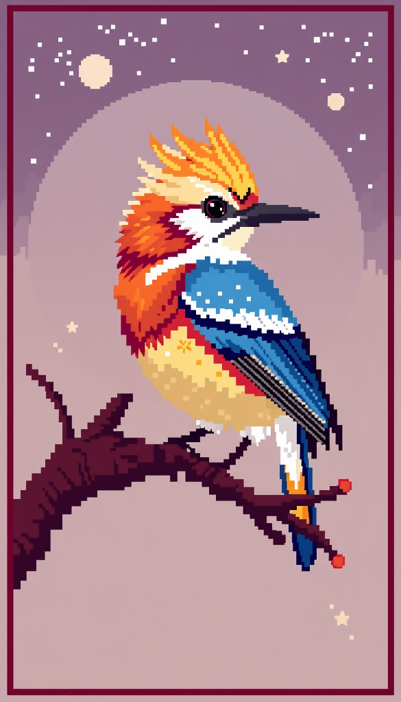 A majestic firebird in pixel art style, glowing with vibrant orange, blue, and golden tones. Perched on a branch beneath a moonlit sky and surrounded by stars, this piece blends retro aesthetics with fantasy storytelling.