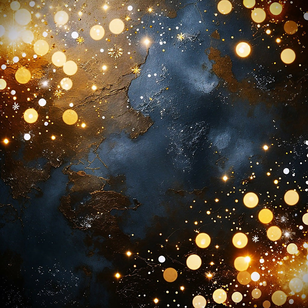 An enchanting abstract composition featuring a deep blue and black cosmic backdrop illuminated by scattered golden and white sparkles. The interplay of glowing spots and delicate snowflake-like shapes creates a mesmerizing celestial ambiance, perfect for elegant interiors and artistic collections.