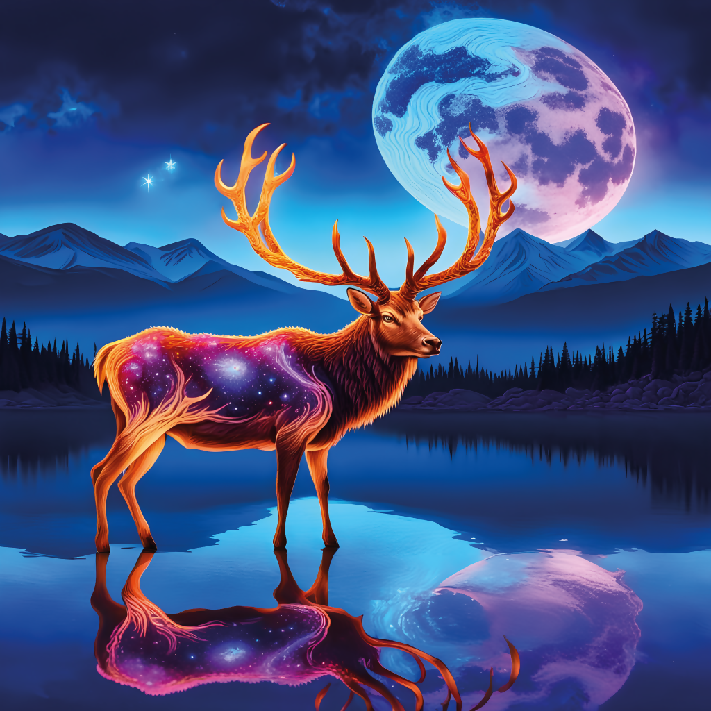 Enter the enchanting world of "Celestial Grace: The Stag of the Cosmic Realm", a surreal fantasy art piece that blends the majesty of nature with the wonder of the cosmos. This highly detailed, otherworldly depiction features a glowing, majestic stag with intricately luminous antlers that mirror the beauty of branching galaxies. Standing gracefully on a crystalline lake, the stag exudes an ethereal presence, surrounded by vibrant bioluminescent plants that bathe the environment in soft, otherworldly light.