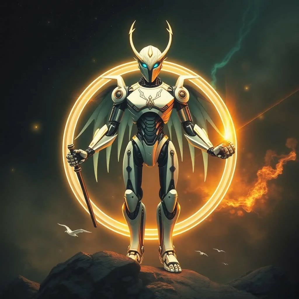 A striking robotic figure stands atop a rocky outcrop, exuding both power and grace. The automaton has a sleek, metallic body with intricate designs, glowing blue eyes, and a helmet adorned with horn-like extensions. Its mechanical wings are spread wide, and a radiant golden halo encircles its form, casting an ethereal light. One hand holds a staff, while the other glows with energy, suggesting immense power and authority. The dark, cosmic sky in the background, along with soaring birds and swirling clouds, adds to the sense of mystique and celestial grandeur. This image beautifully blends elements of futuristic technology and mythical guardianship.