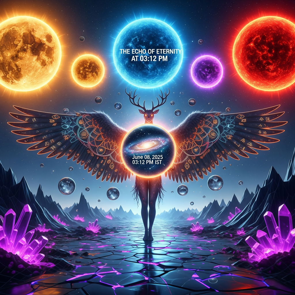 Step into a dreamlike cosmos with Celestial Guardian of the Triad Suns, an exquisite AI-generated surrealist artwork that captures a moment of divine wonder. In a radiant valley of sparkling crystals bathed by three colossal suns, a mythical guardian stands holding an orb encasing a miniature galaxy, frozen at 03:12 PM IST on June 08, 2025, reflecting the celestial dance of Leo, Hercules, and Boötes over India. The guardian’s phoenix wings shimmer with intricate glitch-effect mandalas, while a towering stardust archway weaves the universe’s history, blending surrealist fluidity with baroque elegance and cyber-fantasy glow. This limited-edition digital collectible, available as a high-resolution download or NFT, is a must-have for art lovers and collectors seeking a piece that transcends reality. Add this surreal masterpiece to your collection and let its otherworldly beauty inspire you!