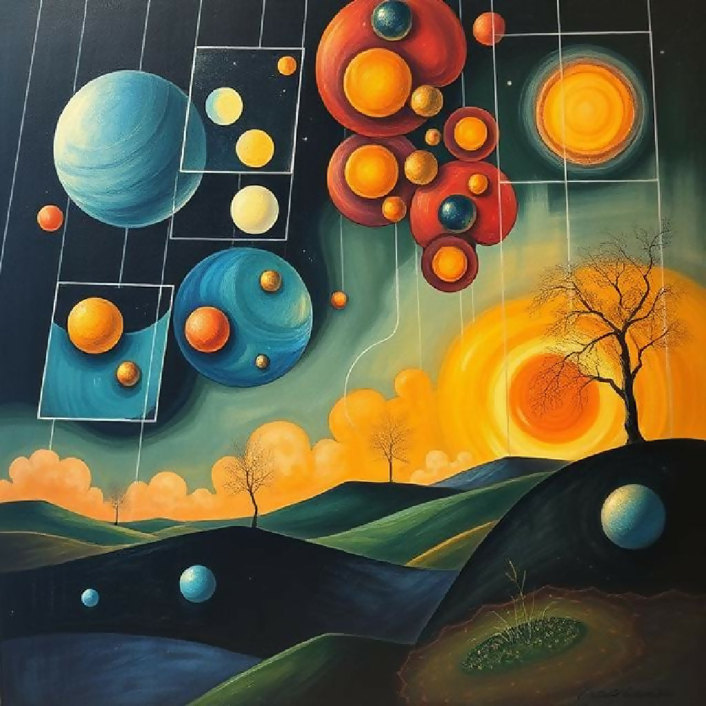 "Celestial Harmony" depicts a surreal and vibrant landscape where cosmic elements blend with earthly scenery. Above rolling green and blue hills, a series of planets and celestial bodies float against a backdrop of dramatic, swirling clouds. Some are enclosed in gridded squares, suggesting a measured observation of the cosmos. Striking, orange suns and moons provide radiant light, contrasting with the deeper hues of the surrounding space. Bare trees stand silhouetted against the sky, anchoring the fantastical scene in a touch of reality. The artwork evokes a sense of wonder, inviting the viewer to ponder the connection between the terrestrial and the vast universe beyond.