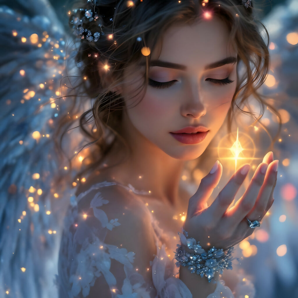A luminous angel stands bathed in starlight, her eyes gently closed as she holds a radiant celestial star between her fingers. Wrapped in delicate floral lace and adorned with shimmering jewels, she glows with divine serenity and grace. Golden sparks swirl around her, evoking the mystery of heaven's light and the quiet miracle of inner peace.