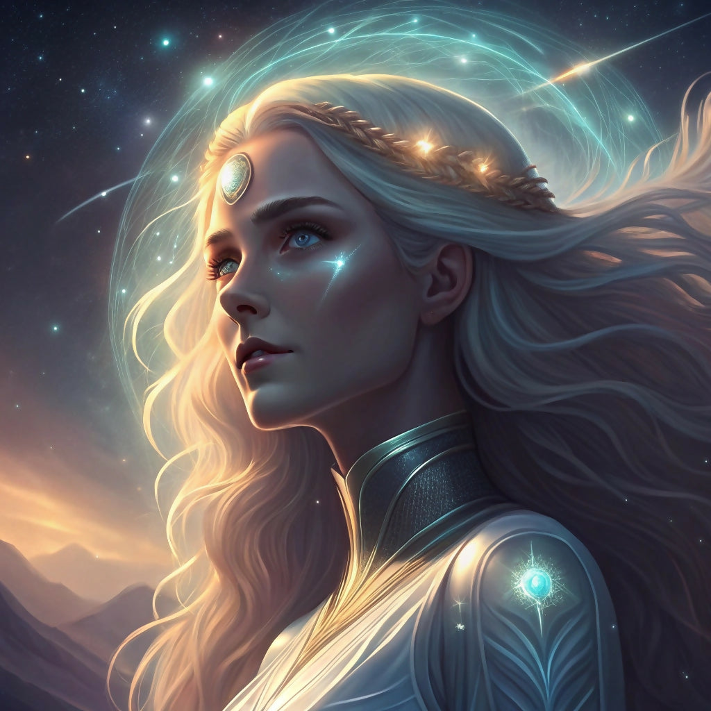 A soft, ethereal glow illuminates the scene. Light blue trails, like shooting stars or celestial rays, radiate outward from around her head.  A starry night sky and a subtle sunset or dawn-like scene are in the background, with distant, mountain-like silhouettes.  The overall impression is one of fantasy, beauty, and celestial imagery.