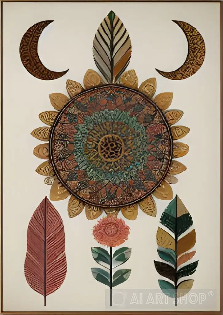On either side, there are two feathers, each with its own unique color scheme and pattern.