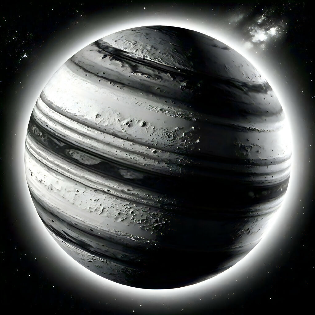 Celestial Marble is a stunning piece of AI-generated surrealism that captures the essence of an imagined planet. This monochromatic masterpiece features intricate details of planetary rings and surface textures, evoking a sense of wonder and exploration. Illuminated from behind, the planet glows with an ethereal halo effect, enhancing the surreal atmosphere of the scene. The distant stars and cosmic vastness in the background add depth, making this artwork a mesmerizing blend of celestial beauty and artistic creativity. Perfect for space enthusiasts, modern art lovers, and collectors who appreciate the fusion of realism and fantasy.