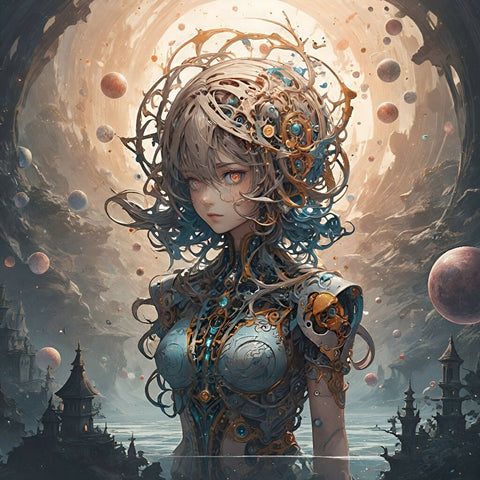 "Celestial Mechanica: Symphony of Stars" depicts Astrid, the goddess of the cosmos, in a breathtaking fusion of art and technology. Surrounded by celestial bodies and ancient castles, this intricate piece symbolizes the harmony of nature and machinery, perfect for those captivated by the mysteries of the universe.