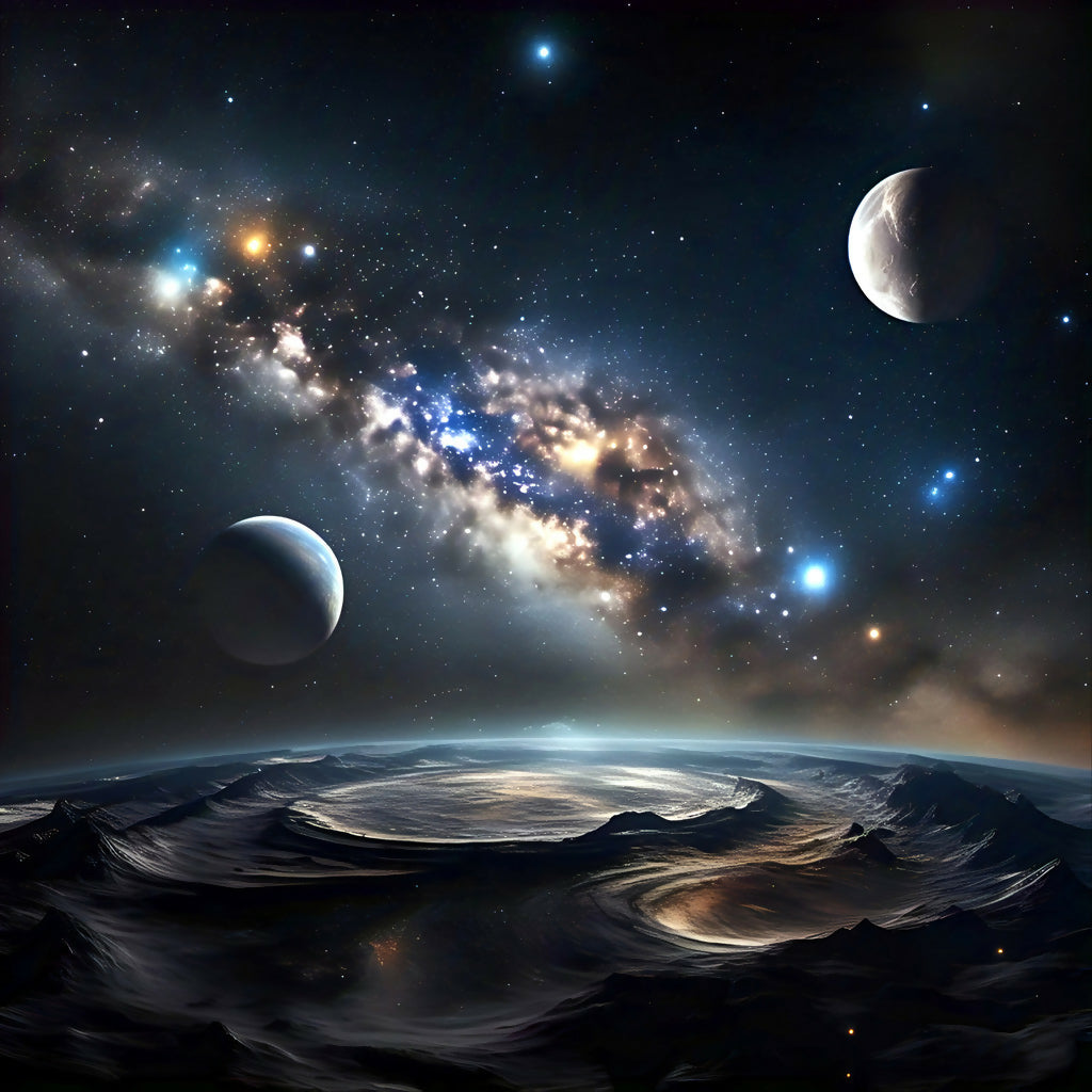 Step into an otherworldly vision with Celestial Mirage, a stunning AI-generated digital landscape that captures the ethereal beauty of space and planetary wonder. This sci-fi inspired artwork showcases a cratered alien terrain, glistening with a reflective liquid surface. Above, two contrasting planets dominate the sky—one a serene bluish gas giant, the other rocky and textured—while a sprawling galaxy of vibrant stars and nebulae arcs across the cosmic horizon. Perfect for fans of fantasy, space art, or surreal landscape aesthetics, this piece evokes a sense of mystery, scale, and celestial serenity. Ideal for wall art, canvas prints, and sci-fi decor, it brings depth and imagination to any space.