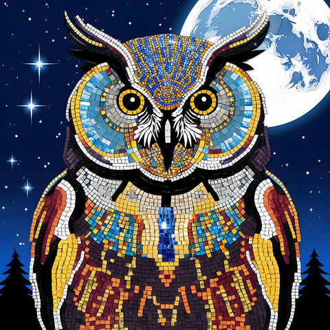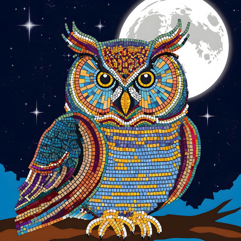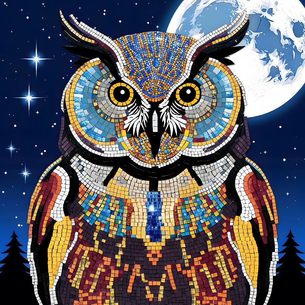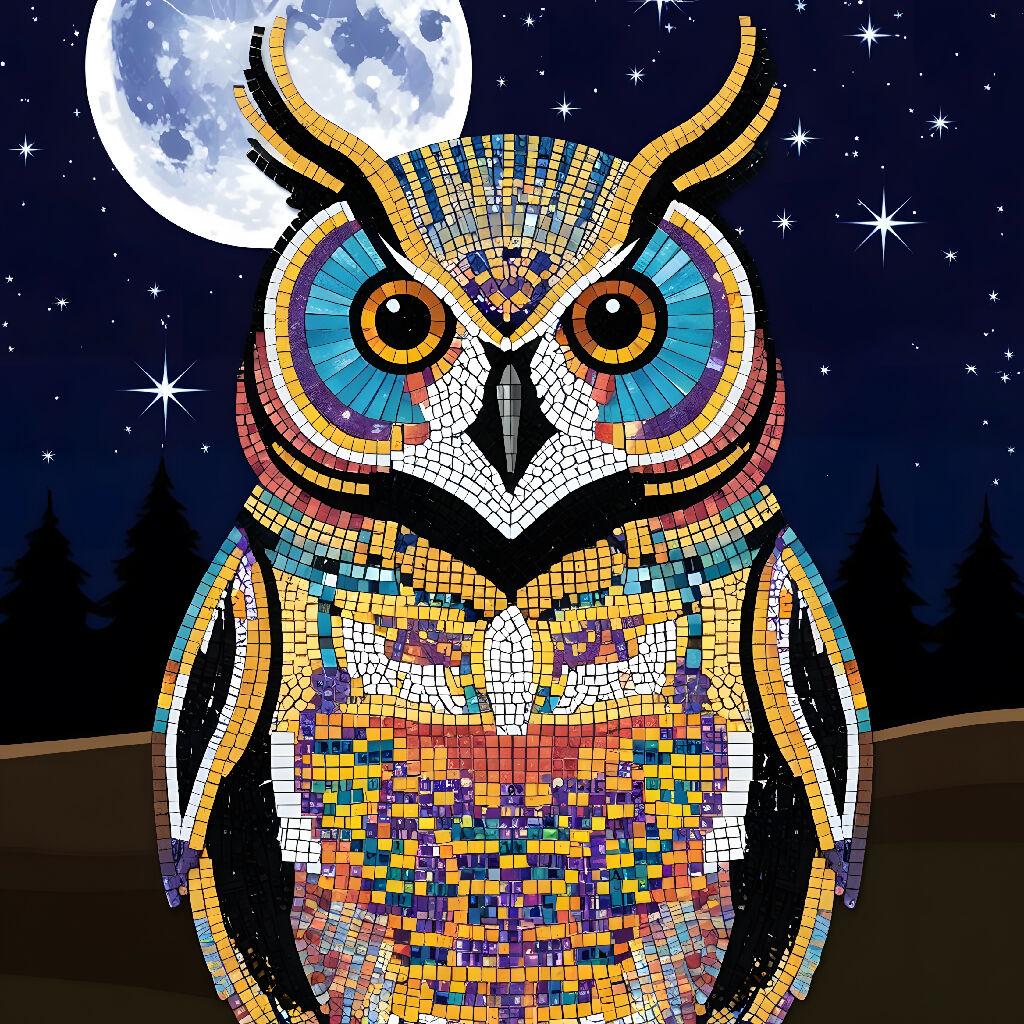 "Immerse yourself in the enchanting beauty of 'Celestial Mosaic Owl,' a digital mosaic artwork that brings a vibrant owl to life through a stunning array of tiny, colorful tiles. Each tile is meticulously detailed, contributing to the owl's majestic and intricate appearance. Set against a dark, starry night sky, the owl stands out with its brilliant hues and patterns, contrasted dramatically by the full moon's soft glow. This artwork captures the magic of the night and the elegance of one of nature's most mysterious creatures, blending vivid colors with a celestial backdrop to create a truly mesmerizing visual experience."