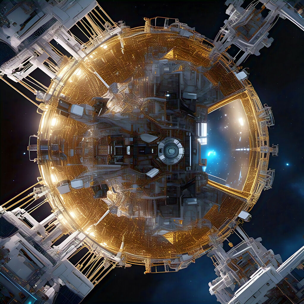 Step into the future of space architecture with Celestial Nexus, a stunning AI-generated artwork that captures the grandeur of a futuristic space station orbiting in the cosmic void. The central spherical structure glows with golden illumination, surrounded by intricate mechanical arms and docking systems—each detail meticulously crafted to evoke advanced engineering and interstellar ambition.