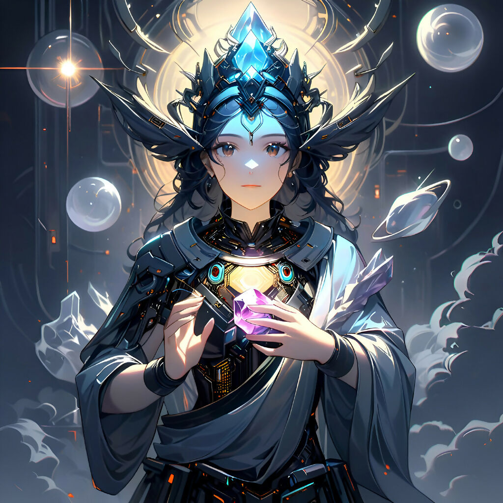 Step into the realm of the Celestial Oracle, a divine being who bridges ancient wisdom and futuristic power. Adorned with a radiant headdress and wielding glowing crystals, this surreal figure stands at the threshold of galaxies, channeling energy from forgotten dimensions. Surrounded by floating orbs and cosmic shards, the Oracle watches over the balance of light and shadow in the universe. This AI-generated artwork blends mythology, sci-fi, and mysticism—perfect for collectors who crave visual storytelling with depth and imagination.