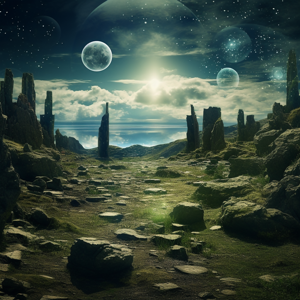 Tags: alien landscape, cosmic sky, surreal nature, fantasy terrain, celestial bodies, digital painting, sci-fi art, rocky path, otherworldly scenery, dreamscape.