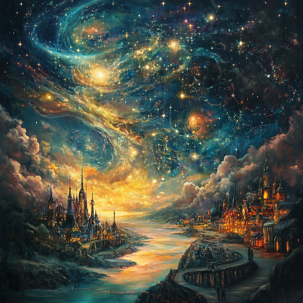 Завораживающее фэнтезийное произведение искусства, изображающее волшебный город на берегу сияющей реки, освещённый сияющим вихрем галактик и звёзд. Яркое небо сливается с зачарованной архитектурой, создавая захватывающую дух картину чуда, тайны и космической красоты. Идеально подходит для любителей фантастических миров, волшебных пейзажей и искусства, вдохновлённого небесными явлениями.