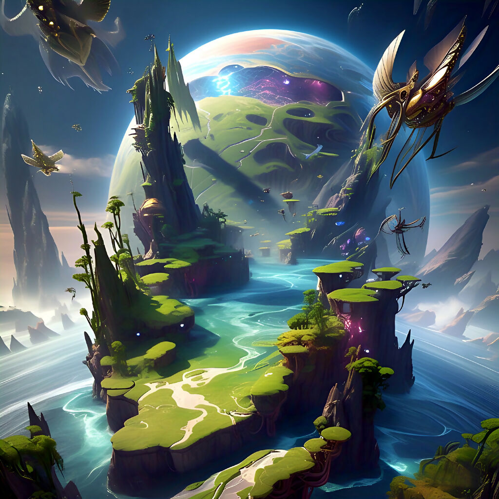 Step into a world beyond imagination with Celestial Riverlands, a breathtaking AI-generated landscape artwork that fuses nature with cosmic fantasy. This surreal terrain features winding rivers cascading through elevated green plateaus, all under the gaze of a massive, glowing alien planet. Floating islands and futuristic aerial creatures drift across the sky, adding depth and wonder to the scene. Perfect for sci-fi lovers, fantasy enthusiasts, and digital art collectors, this piece evokes exploration, serenity, and the thrill of discovering a new world. Ideal for wall art, posters, and concept design inspiration.